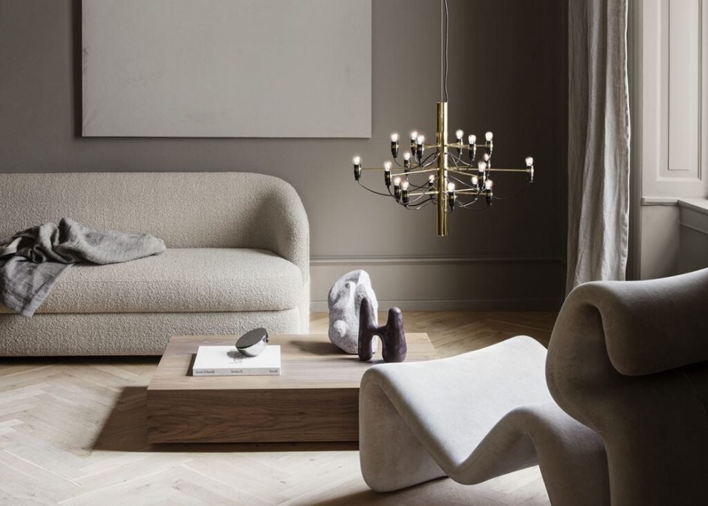Gino Sarfatti designed the 2097/18 Chandelier for Flos in 1958 as a modern interpretation of the traditional chandelier. The chandelier celebrates the inner workings of lighting design and puts the frosted bulbs and cables centre stage. With 18 arms, this edition is smaller than the original, making it perfect for smaller spaces.