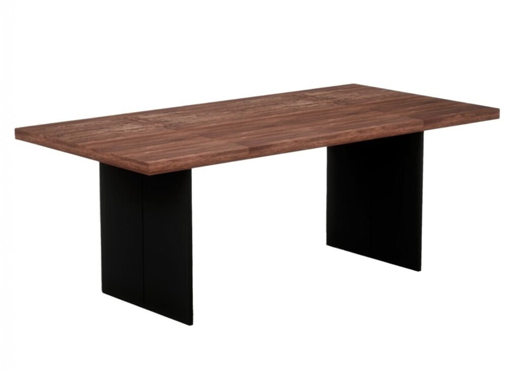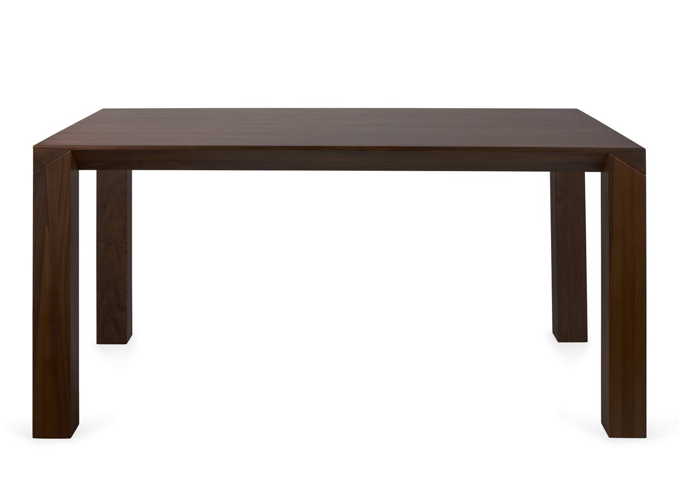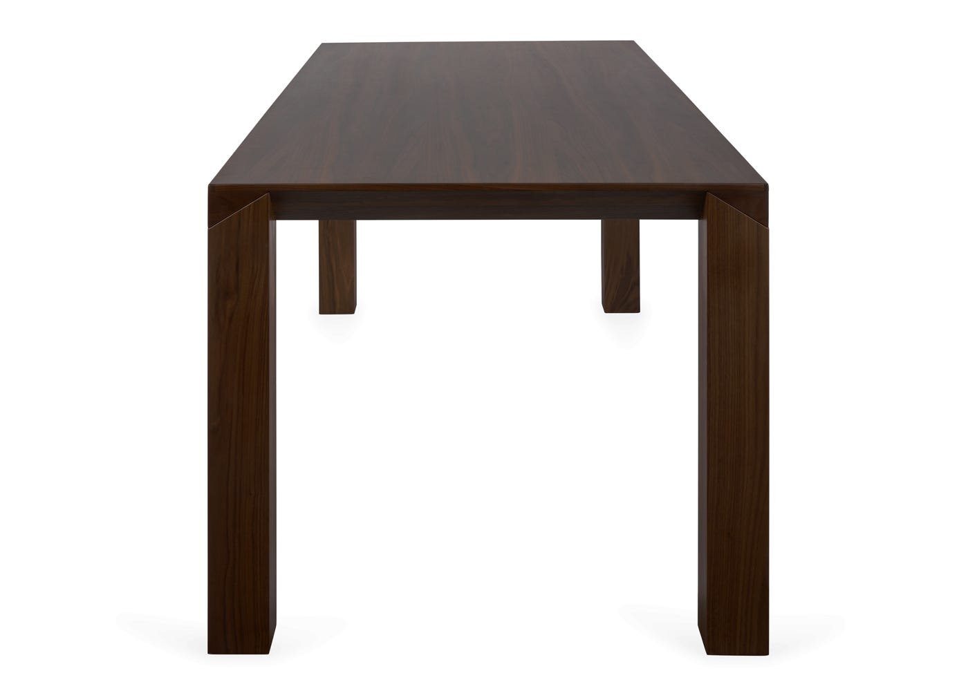 The dark stained walnut top, with its chamfered profile, achieves a sleek and lightweight aesthetic without compromising durability.