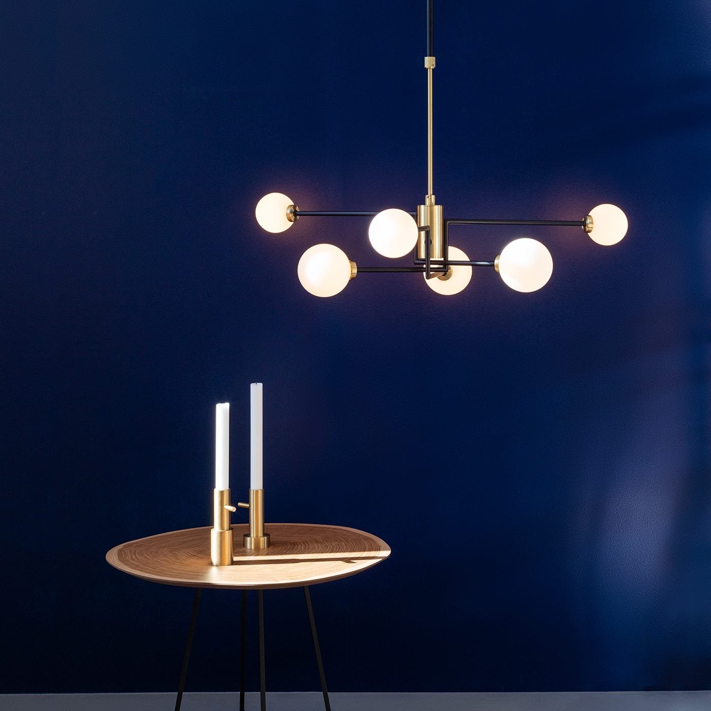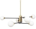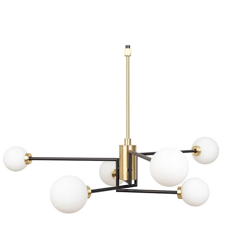 The Balance multi-arm chandelier matches a smart black and brass finish with white opaline bulbs for a modern look.