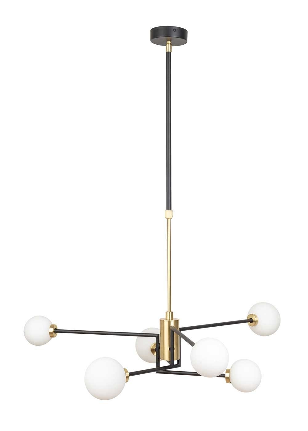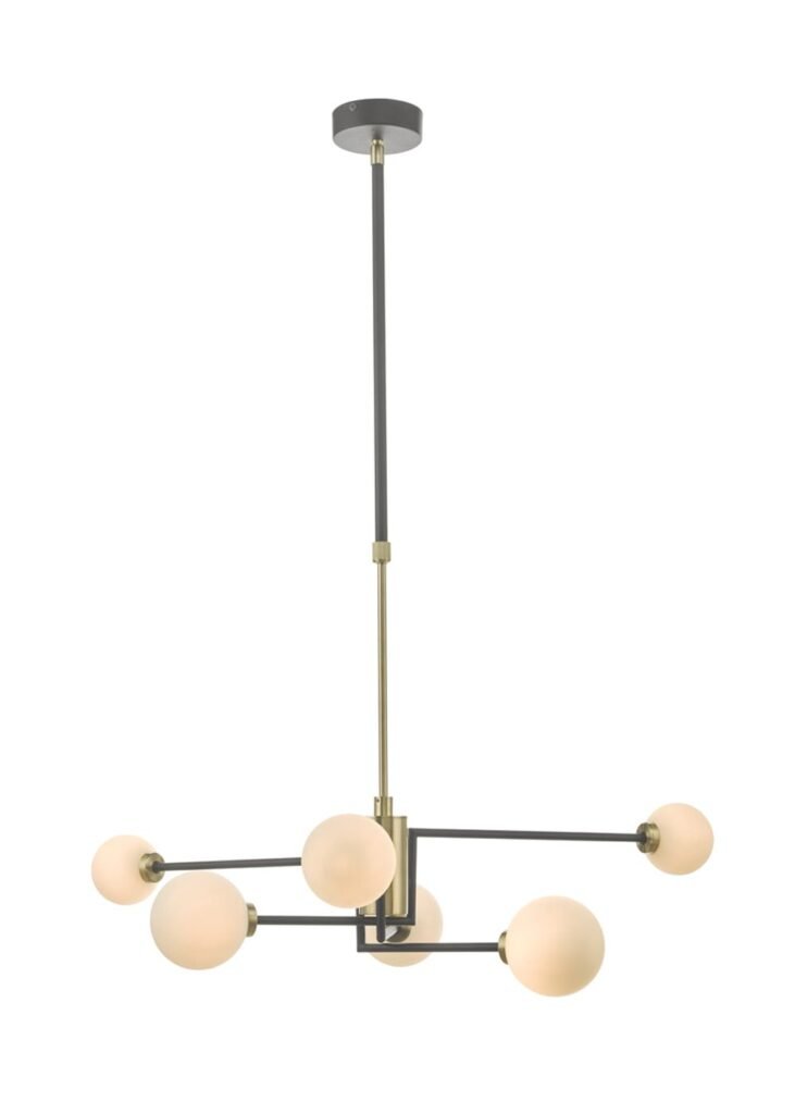 A statement piece for your interior, this multi-arm chandelier matches a smart black and brass finish with 6 opaline globes which direct a crisp clean light around the room.