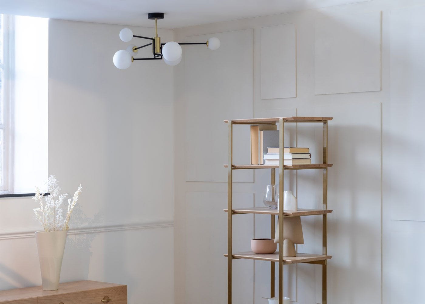 This exclusive Heal’s Balance Multi-Arm Flush Chandelier creates a contemporary optical illusion designed on the premise of Balance. Sitting flush to the ceiling, the chandelier boasts six opaline globes which cast a warm, soft glow throughout the room. This chandelier is perfect for hanging over dining tables or in stairwells.