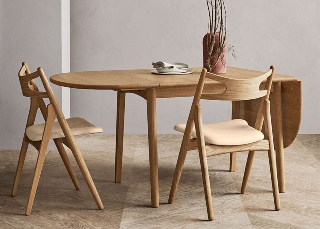 The CH002 is the smaller of two dining tables that Hans J. Wegner created in 1982. The table expresses Wegner’s functional design philosophy through an appealing solution for modern interiors. The CH002 is crafted to fit smaller spaces, and can be extended easily with two accompanying leaves.
