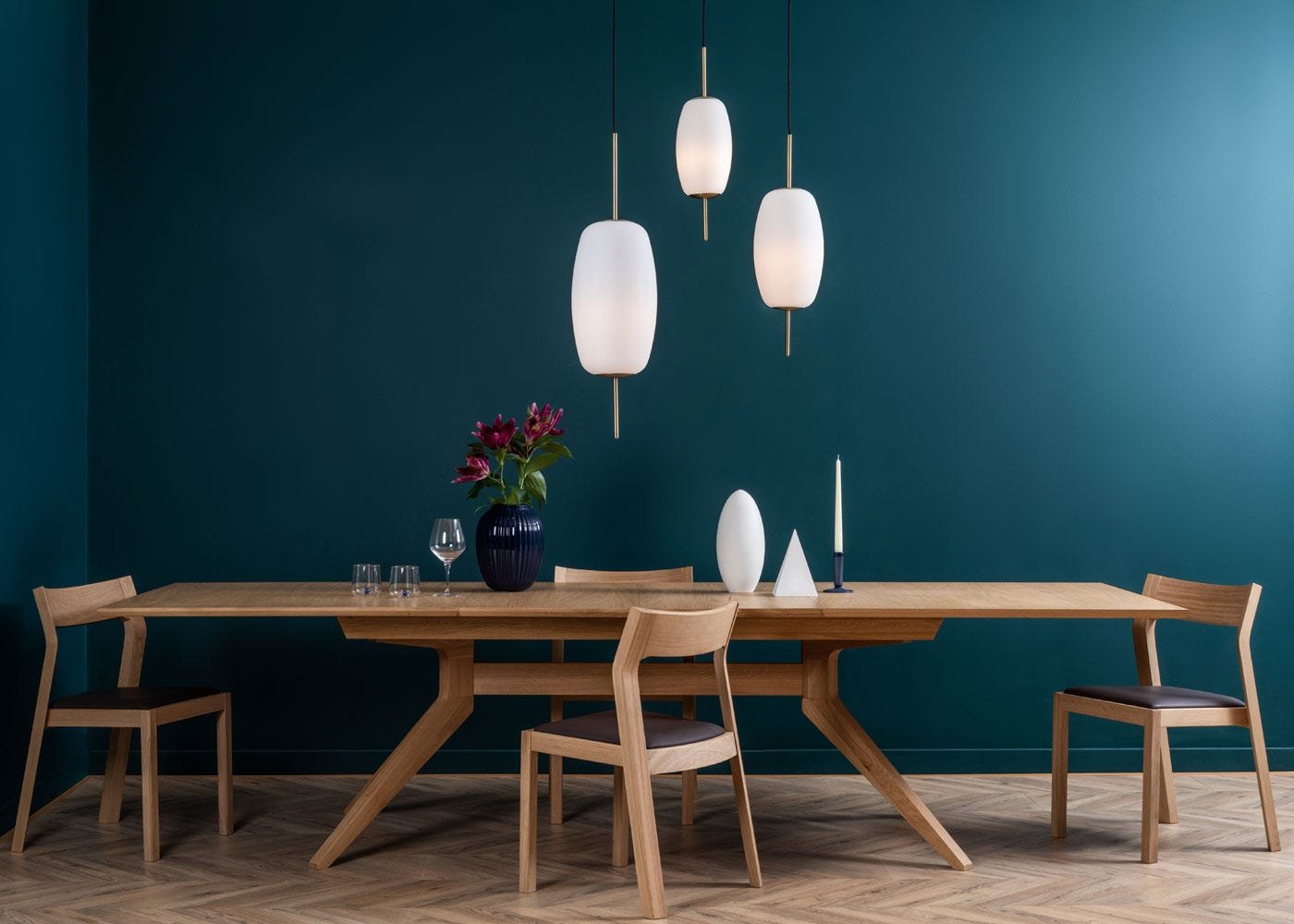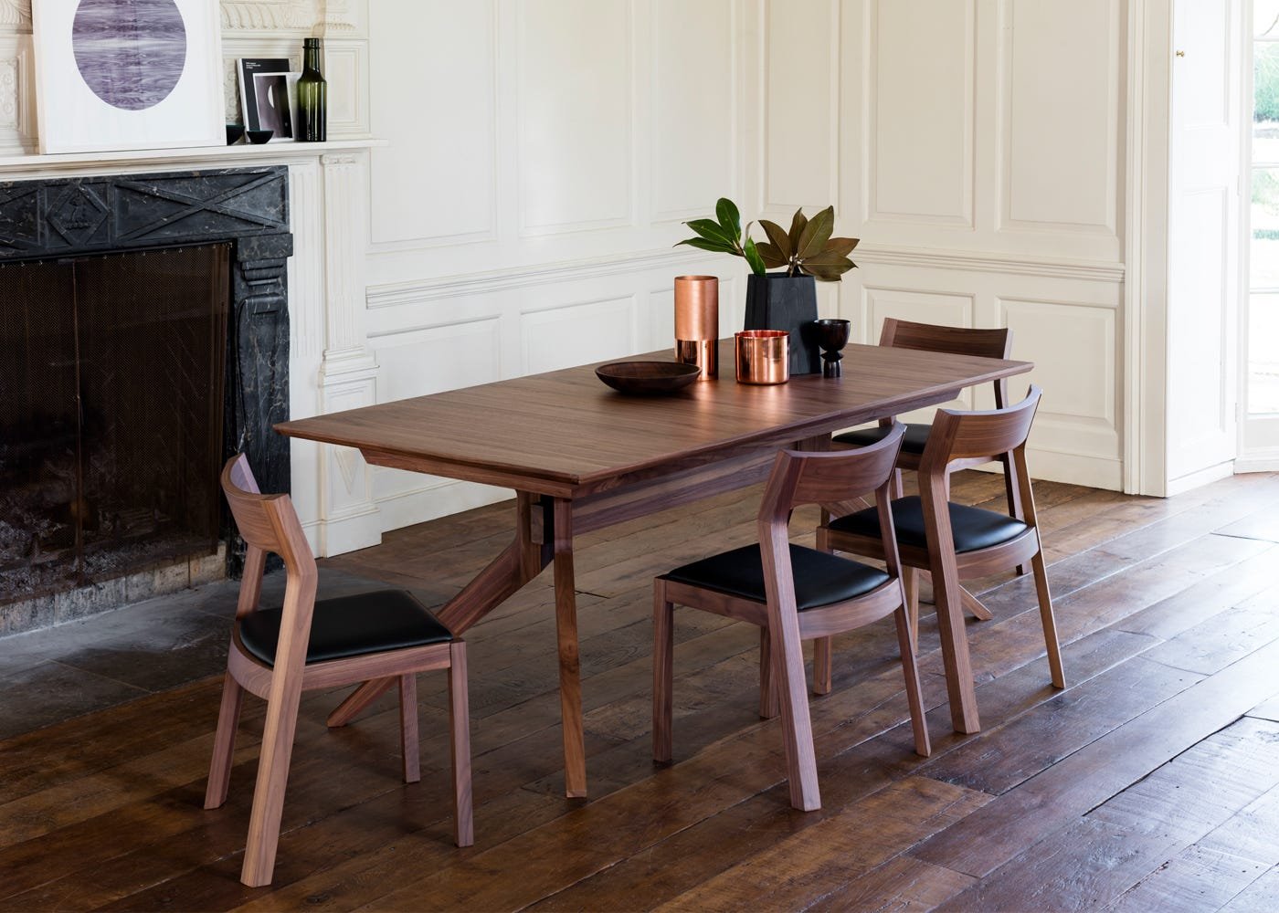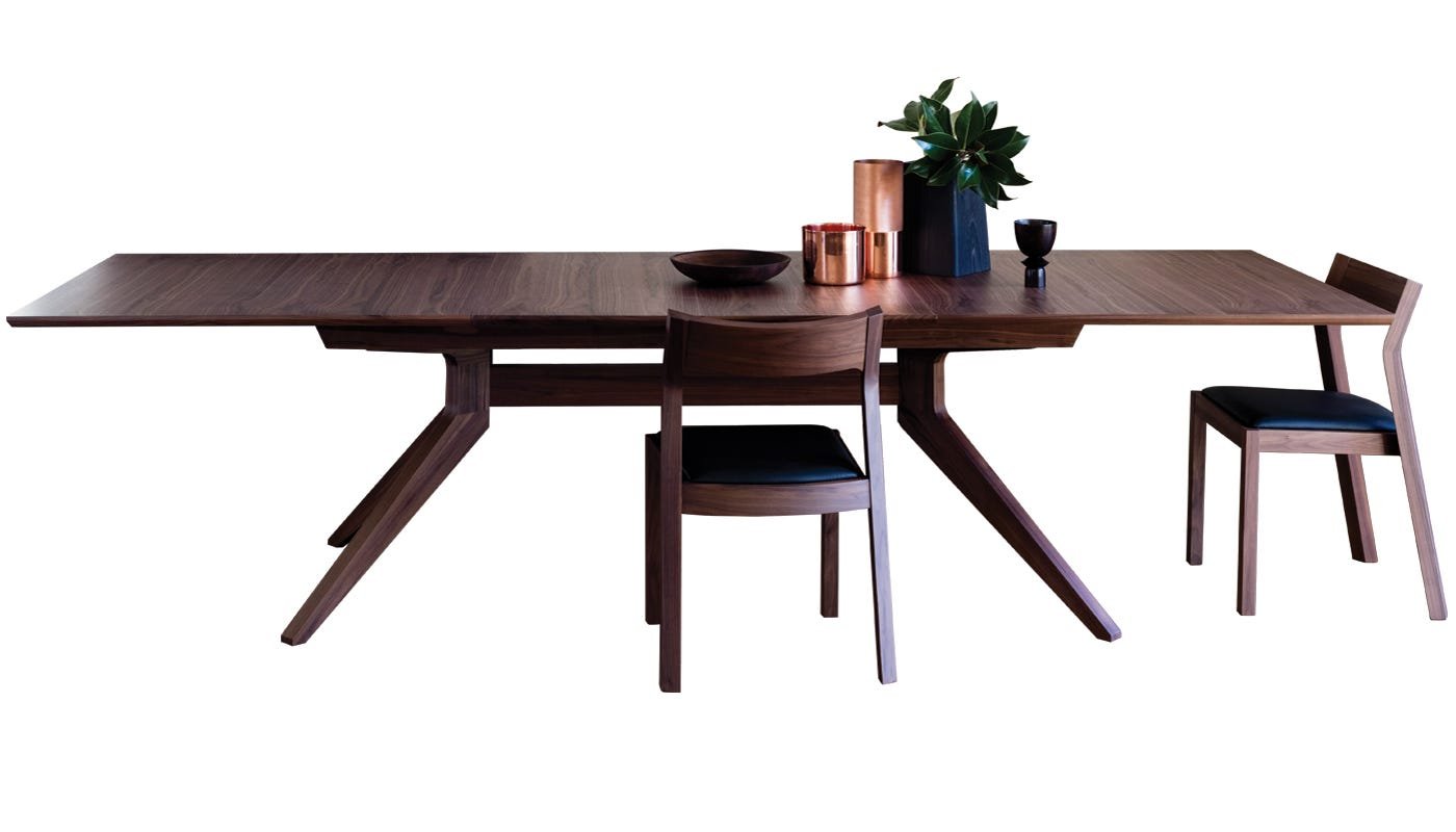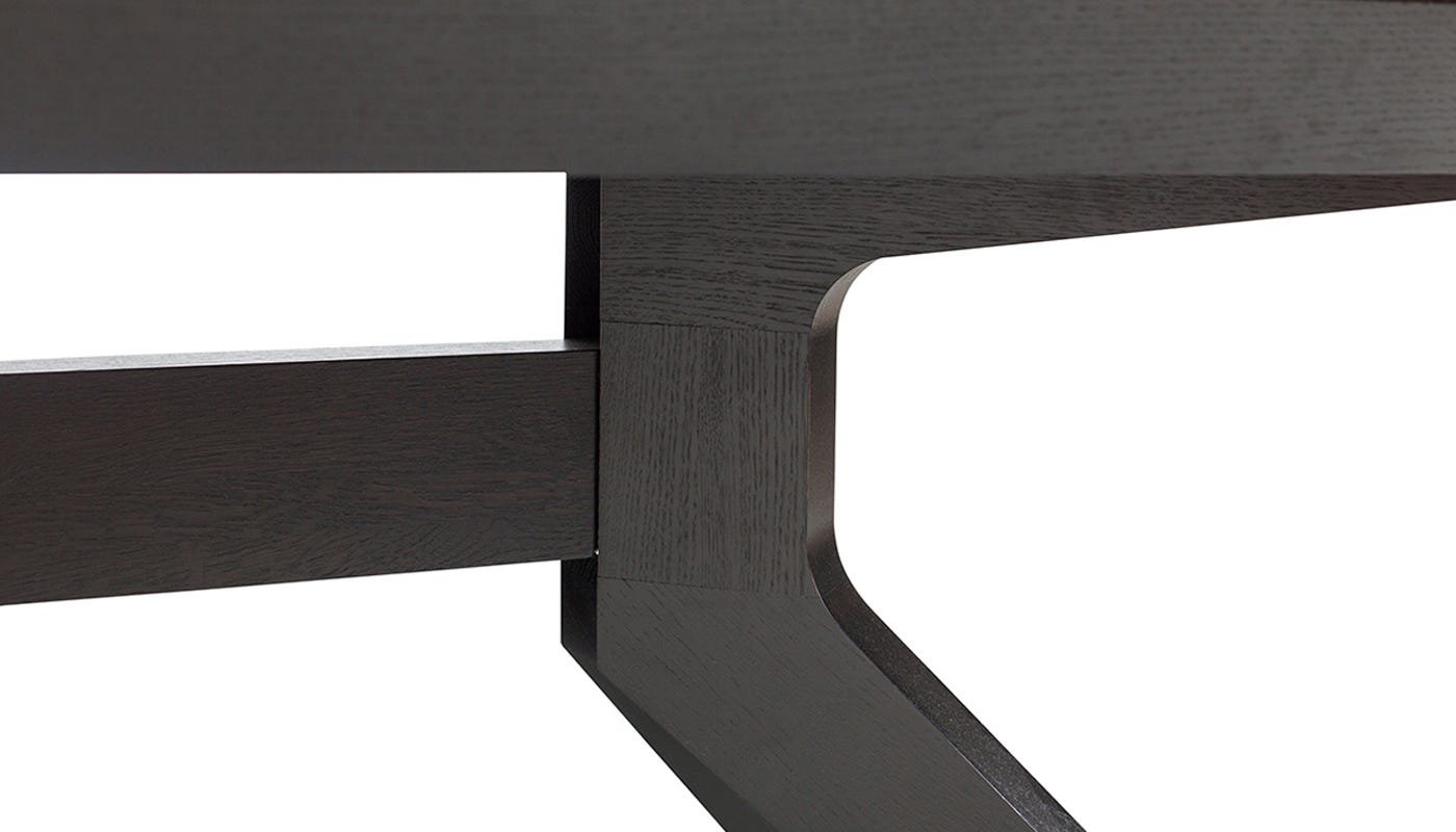 Constructed from walnut or oak (natural or black stained), the Cross Table features a smooth veneer along its top with angled legs providing a distinctive profile. The design exemplifies Matthew Hilton’s ultra-modern approach to wooden furniture craft.