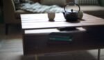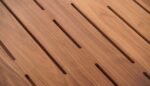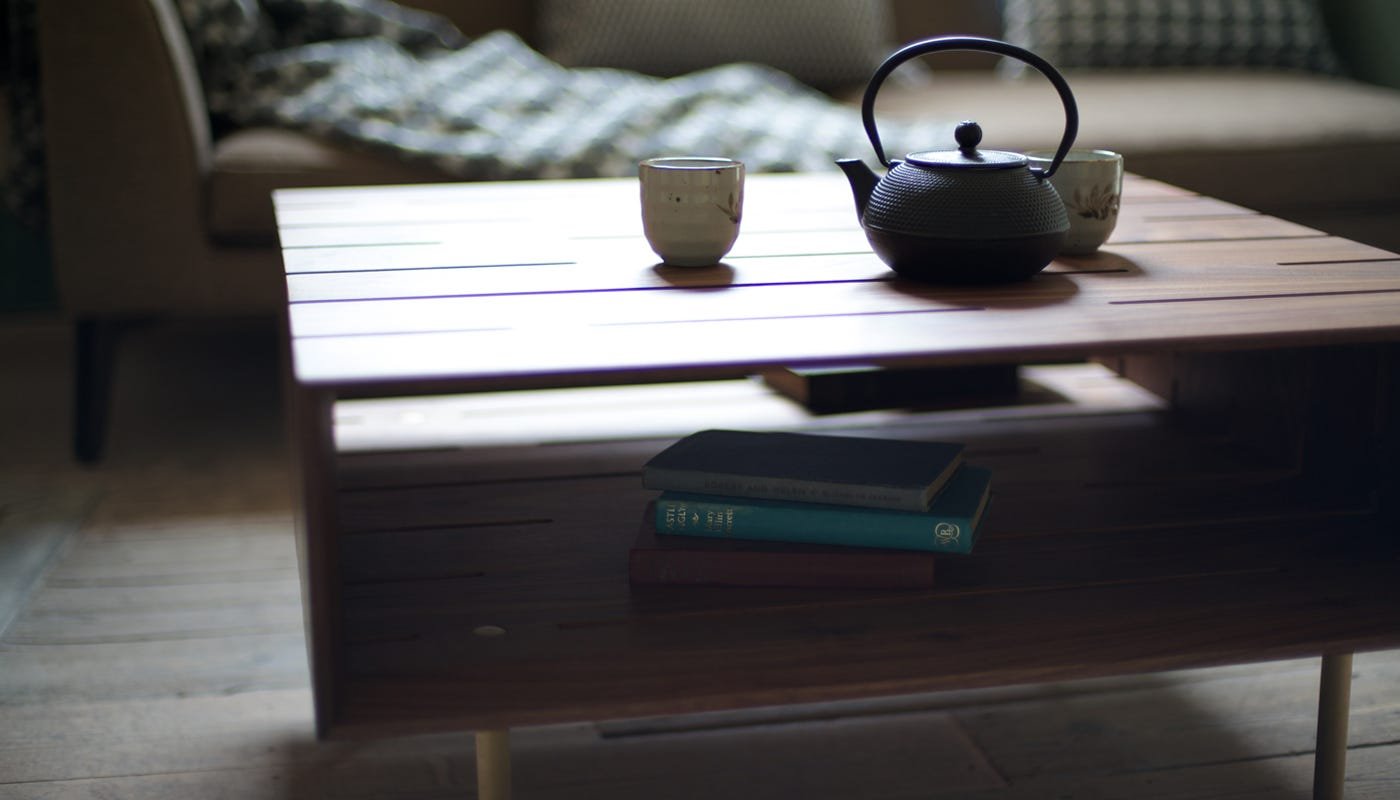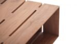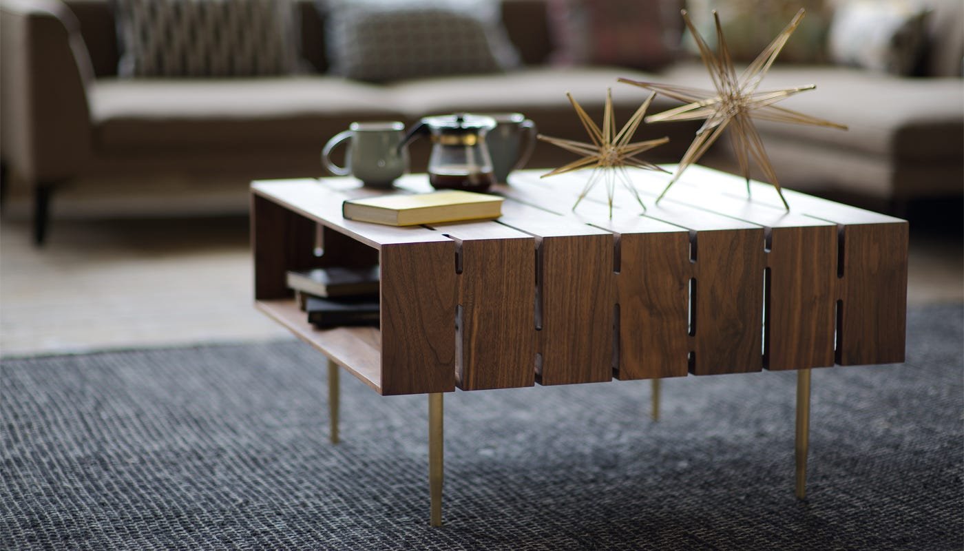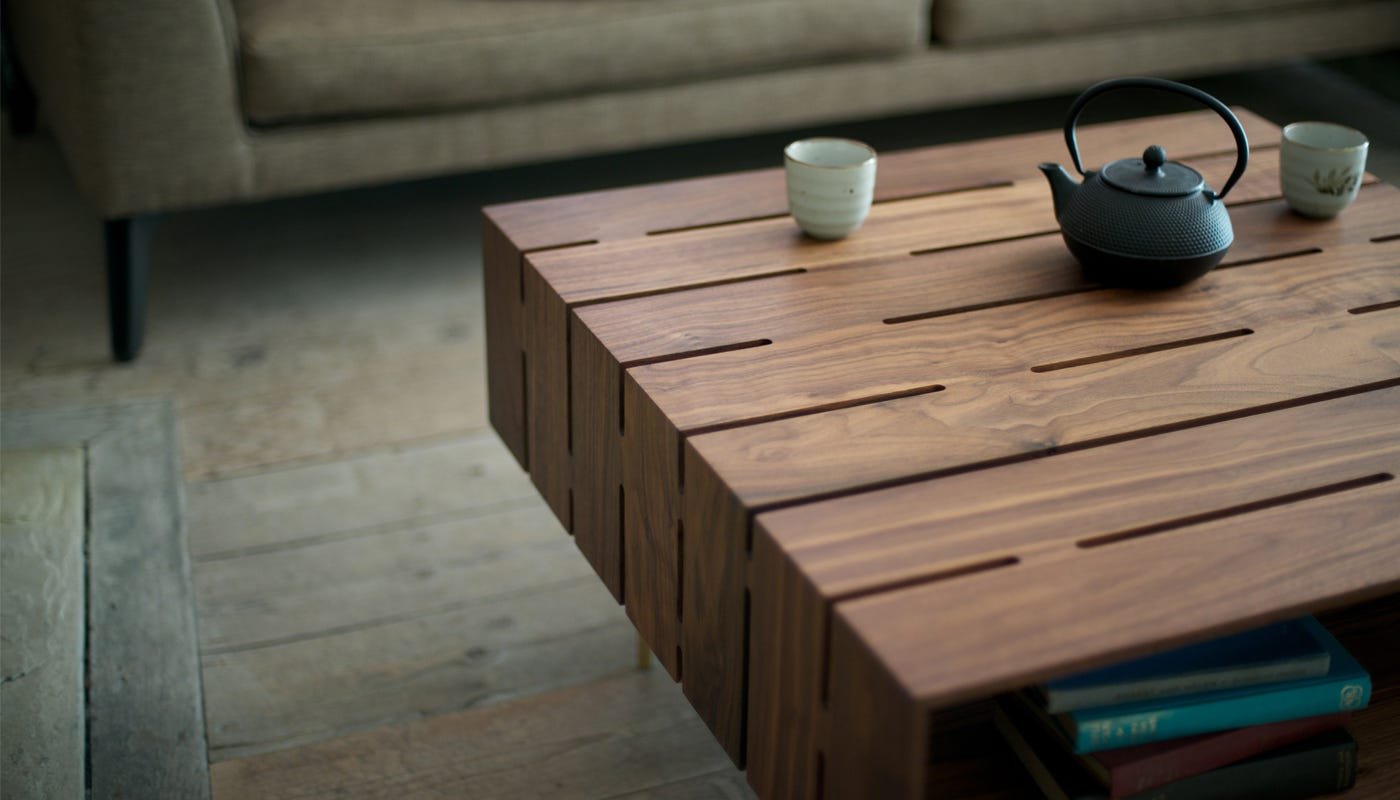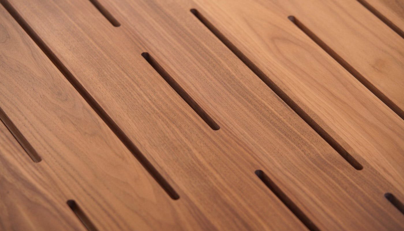 The table is crafted from solid American black walnut using complex joinery techniques and finished with a series of pierced slots that allow light to shine through.