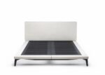 Designed by Matthew Hilton for De La Espada, the 400 McQueen King-Size Bed boasts black cast-iron legs with grey Canvas 2 114 upholstery. The strikingly contemporary bed is defined by its angular headboard and upholstered body. It is finished with cast-iron legs that add a light industrial touch to the design. The bed is upholstered in Kvadrat’s Canvas 2 fabric in a grey finish. Created by ‘colour master’ Giulio Ridolfo, the fabric is woven using a virgin wool blend that lends the bed a soft finish.