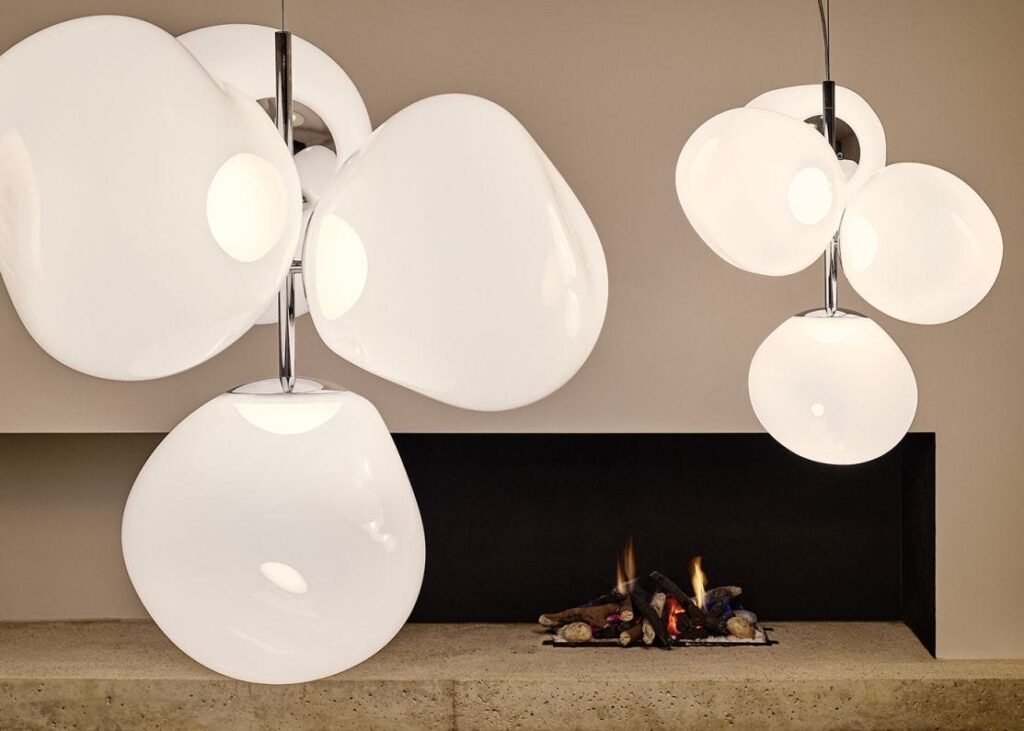 Expanding the Melt family to gigantic proportions, Tom Dixon has introduced the Melt in two new chandelier versions. The small has 4 Melt large pendants, and the large has 7 Melt large pendants. Its molten form and finish captures the warm glow and organic shapes produced during traditional glass blowing. Its unique silhouette and intricate swirling patterns are created using state-of-the-art vacuum moulding. Only becoming translucent when lit, the light makes a design statement even when not in use.