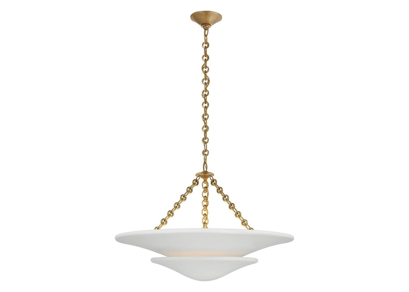 The Mollino by AERIN offers a contemporary take on old-world elegance. Suspended from a jewellery-like chain, the lightweight shallow bowl shapes in a plaster finish recall 1930s French sculpture yet deliver modern sophistication. The emanating warm glow will add subtle luxury to entryways, dining rooms or hallways.