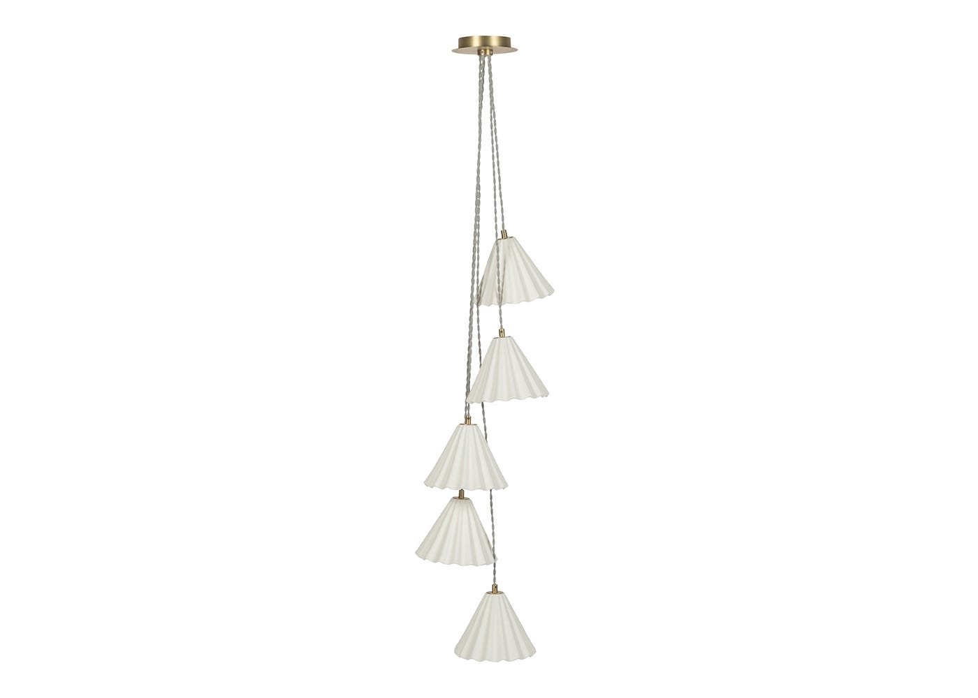 Drawing inspiration from Marilyn Monroe’s famously billowing skirt, the Monroe Porcelain 5 Light Chandelier Pendant offers a modern twist on classic elegance. Each porcelain shade can be height adjusted and emit a soft, warm light, creating a cosy atmosphere the chandelier is adorned with brushed satin brass effect metal components and pale grey fabric-covered twisted cables, making it a stunning focal point for any interior.