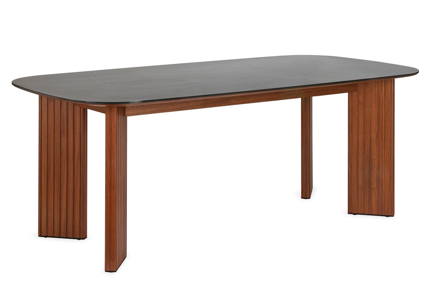 Comprising a sideboard, dining table, side table, dining chair, AV unit and coffee table, the Riga collection demonstrates a mastery of premium materials, combining solid and veneered walnut with elegant ceramic. The entire range is characterised by its signature slats, from the front of the sideboard to the legs on the tables, complete with grey ceramic tops. Finer details come in the form of soft-close hinges and solid lipping, with handle-less opening on doors where they appear. Across the storage solutions, adjustable shelving offers flexibility and maximises space. Solid, hard-wearing and tactile, complement Riga with other pieces in the collection for a cohesive look.