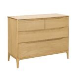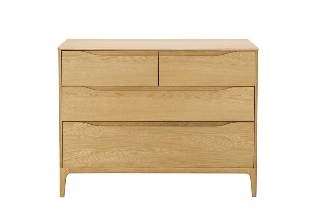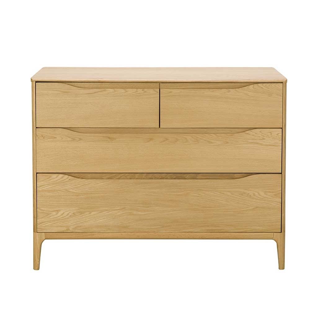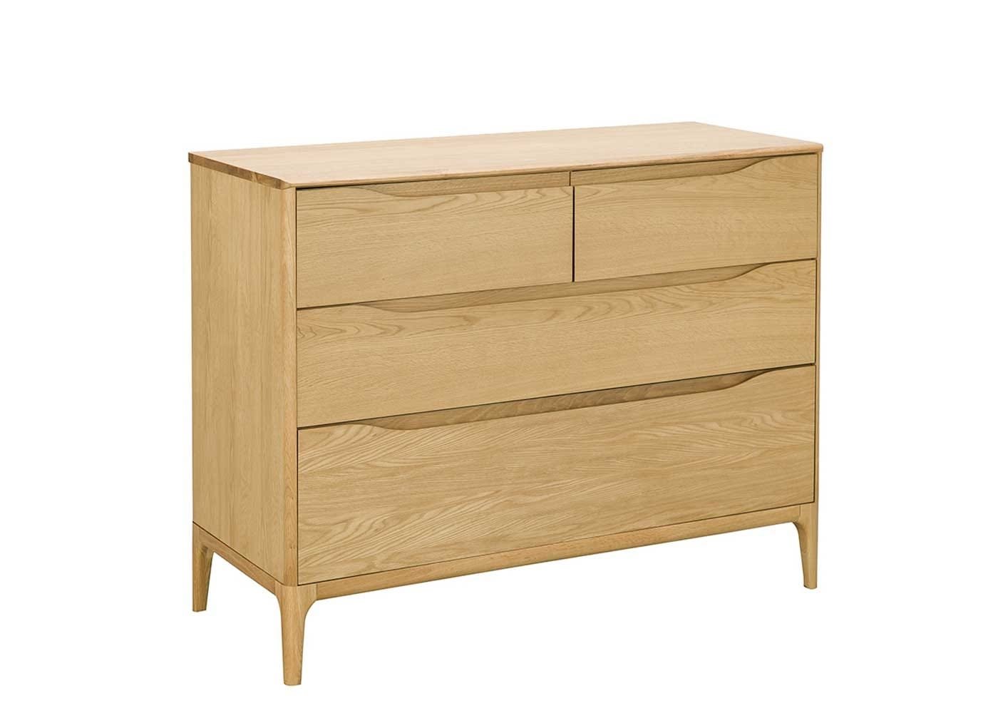 Created by the ercol Design Studio, the oak Rimini 4-Drawer Wide Chest boasts two full-width drawers and two smaller ones to provide practical bedroom storage.