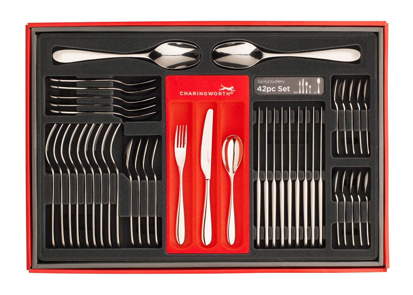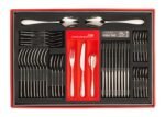 Bringing together all the essentials for a functional dining cutlery, contained within this 42 piece set contains a four piece place setting for ten guests including table forks, table knives, dessert spoons, tea spoons and 2 serving spoons. Featuring a smooth curved handle ridge along the length of each piece, the contemporary form of this collection is shown in its soft rounded lines and mirror finish. Exquisitely worked from stainless steel, this gleaming set of cutlery will become a fixture of family get-togethers and formal dinners for years to come.