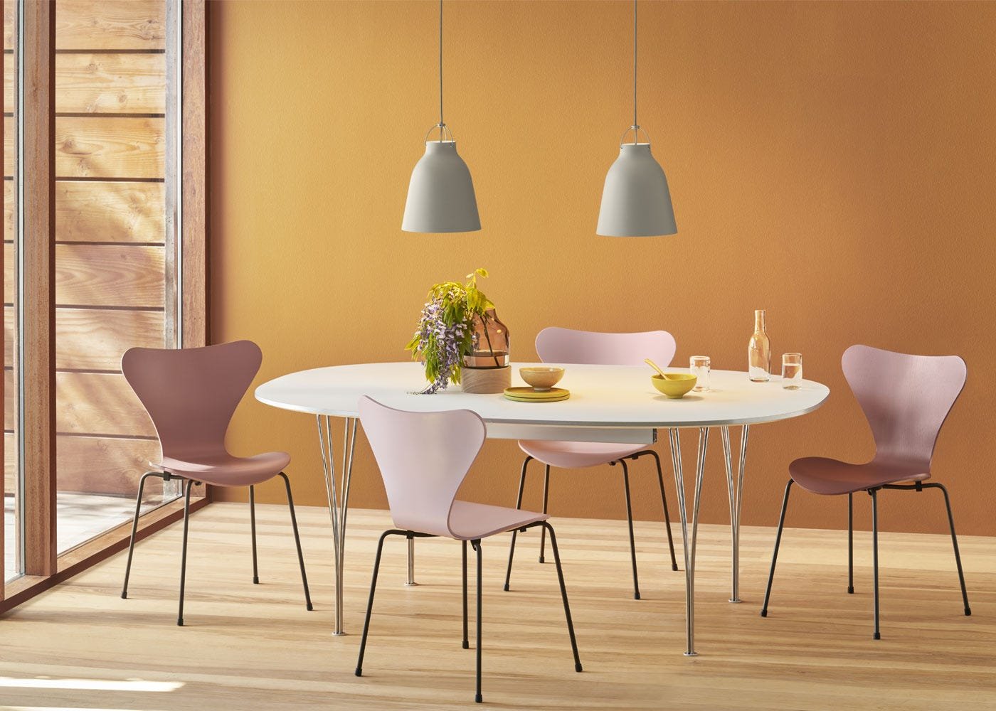 A ubiquitous design that still grabs your attention, the best-selling Fritz Hansen Series 7 Chair, first produced in 1955 by Arne Jacobsen is one of the most enduring designs of the 20th century. A truly timeless piece, the flowing form of the seat anticipates 1960s pop style, while the thin tubular legs nod to classic modernist industrial inspired design. A culmination of Jacobsen’s experimentation with pressure moulded, laminated furniture the swooping curves along the backrest mirror those of the seat, while a pinched, cutaway waistline on the lower back provides a graceful silhouette. To finish, a beautifully textured lacquer is applied in a variety of colours.