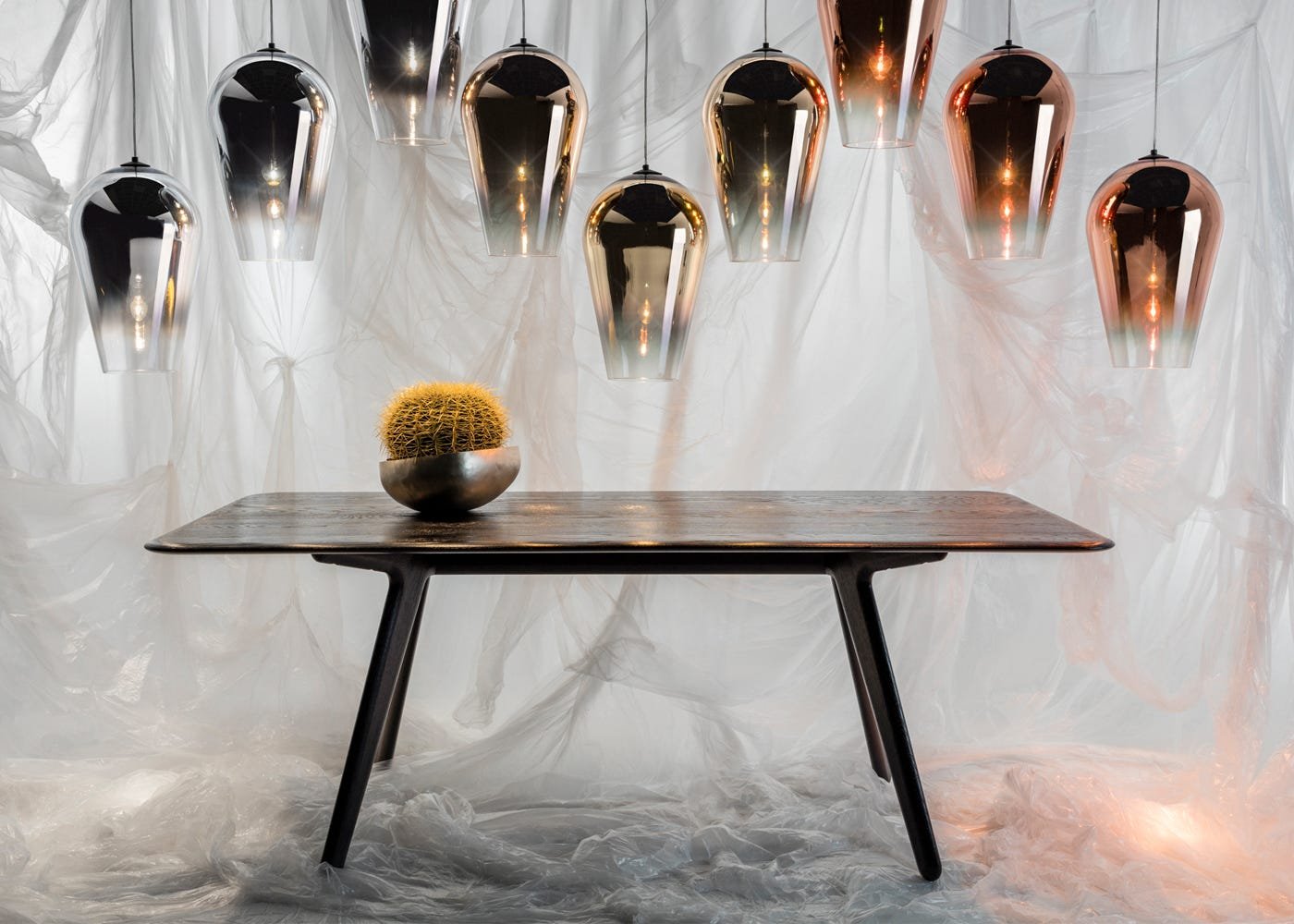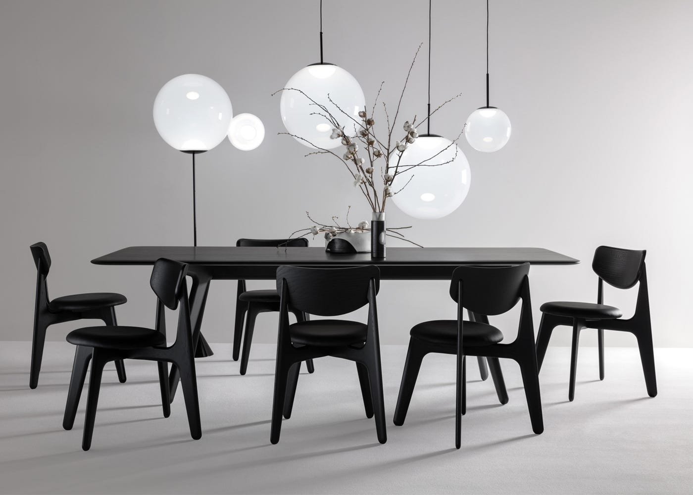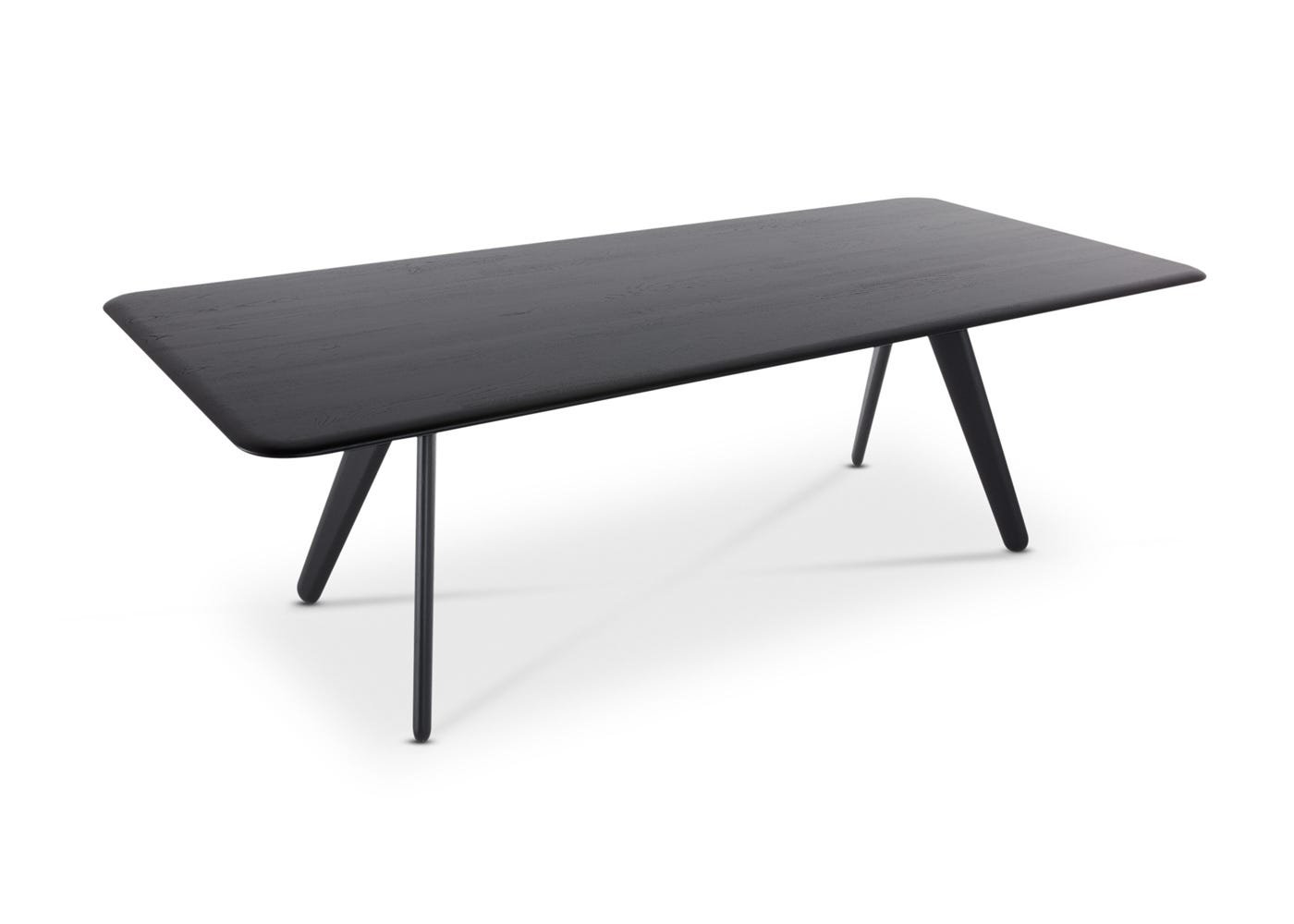 Solid oak finished in a black lacquer lends a clean but textured surface to the table.