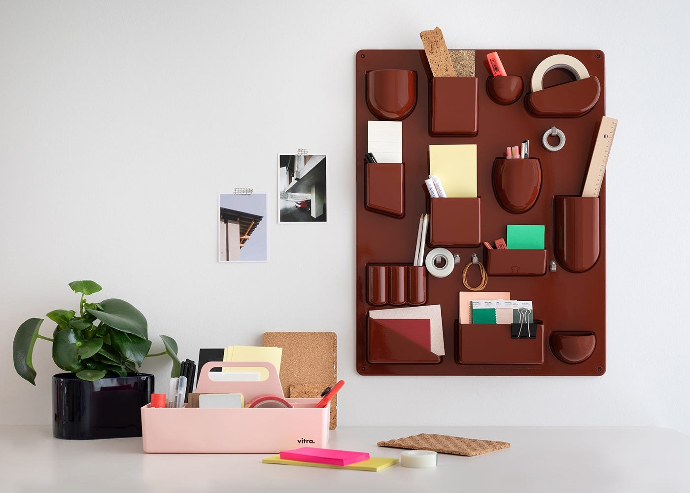 Uten.Silo RE is a storage system for use on the wall. Designed with containers of different shapes and sizes, metal hooks and clips, it brings order to offices, kitchens, workshops, bathrooms and children’s rooms. Uten.Silo RE is available in the original size from 1969 – Uten.Silo RE I – as well as in the smaller version issued in 1970 – Uten.Silo RE II.