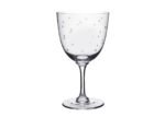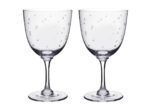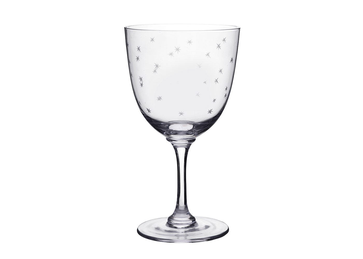 A pair of hand-blown and hand-engraved wine glasses with a delicate cut star pattern around the glass. Each glass is made from fine lead-free crystal and is dishwasher-safe. Perfect for any style of table or type of occasion.